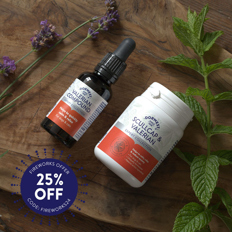 Get ready for Firework season with Dorwest’s Calming Combo Pack, featuring best-selling Scullcap & Valerian Tablets and Valerian Compound. Specially formulated to reduce anxiety during fireworks, travel, and stressful situations, Scullcap & Valerian Tablets are proven to calm with 87%* of dogs in a 2022 University of Cambridge trial seeing less anxiety after use. Great for naturally supporting your pet’s calming pathways, without causing drowsiness. Valerian Compound helps calm your pet quickly, taking effect within 30 minutes and lasting up to two hours – perfect as a top-up to the tablets.