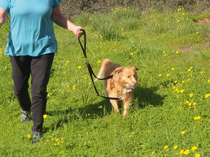“I use, and teach my clients to use, a balancing TTouch harness to which a double-ended lead is attached in two places (on the back of the harness and on the front at the chest).