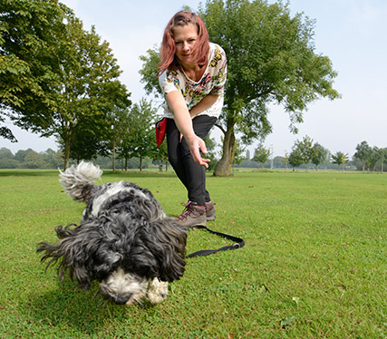 “You can then start adding other exercises in, like down, sit, or even stepping away and calling the dog to you, before they can go to get the treat.”