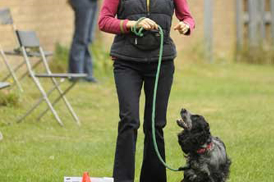 During the course the dog is expected to work in a happy, willing manner, on a loose lead, and in a heel position that is more relaxed than for traditional obedience. The rough guide is that the dog's head should remain within reach of the handler's fingers (or at least theoretically so, if he is a small dog!).