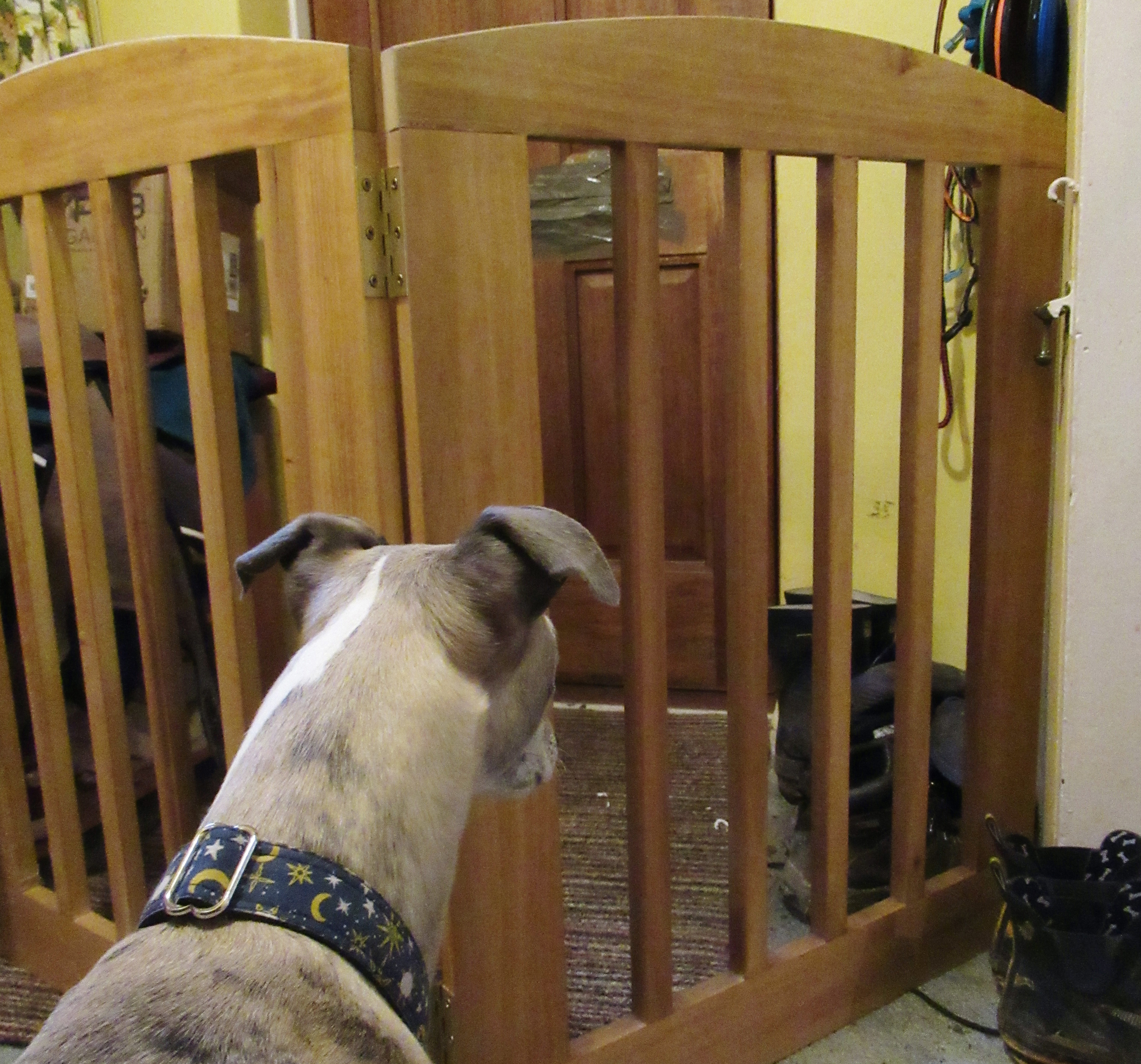 - For young puppies or dogs in training, create a safety zone around exit points. This can be done with temporary dog gates placed around the front door to create a barrier between your dog and the outside world.