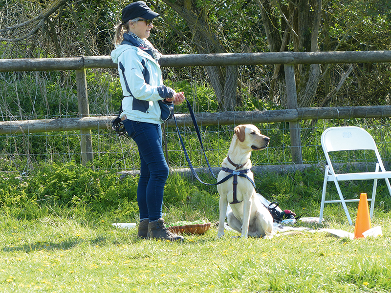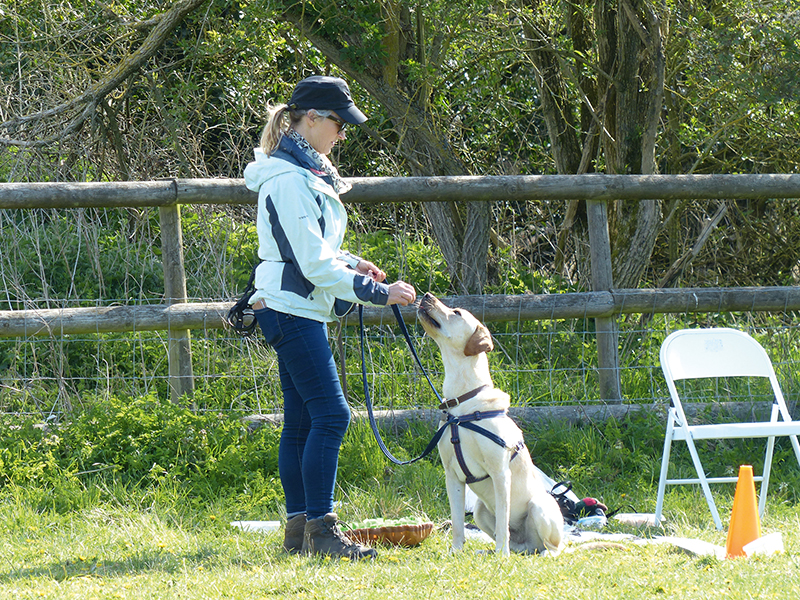 Labrador Ronnie practising the ‘Where’s the dog?’ game in a reactive to responsive class.