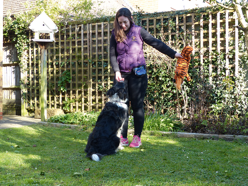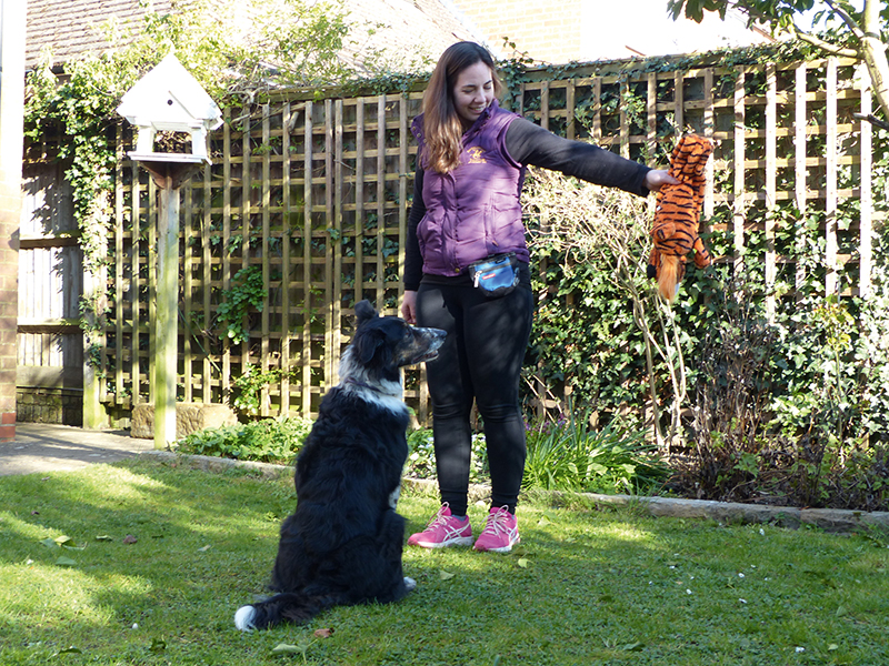 Teach the ‘Where’s the dog?’ game at home with a toy first. Here Kizzy is learning to look at a toy and be rewarded for it.