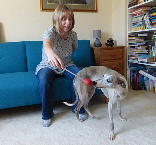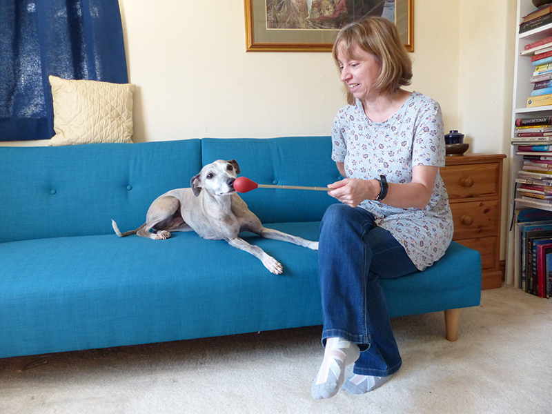 Target stick training is fun, easy to teach, and gives you a longer reach when training from your chair so you can work at a short distance from your dog. The idea is that you teach your dog to touch the end of the target stick with his nose first, and then to follow it as you move it. Extending, telescopic target sticks are ideal as you can adjust the length, but if you don’t have one, improvise with a piece of dowel or a wooden spoon.