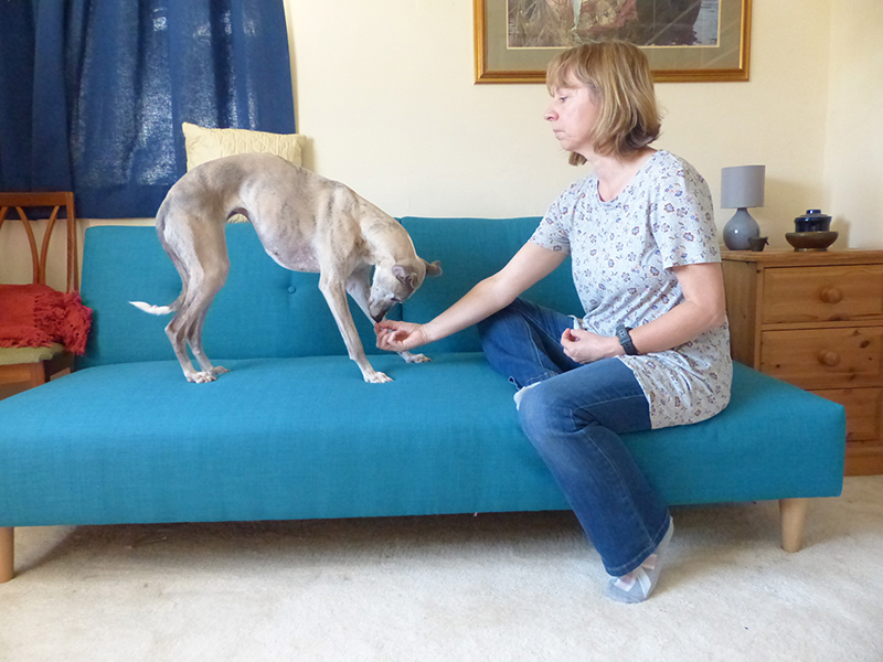 1. Have your treats ready and pat the sofa beside you. As your dog jumps onto it say ‘Up, up’ and feed him. If he needs encouragement try throwing the treat onto the sofa or luring him up.
