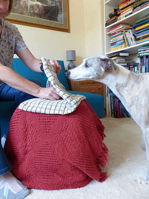 Place a treat in the fold of a towel laid on the arm of your chair or a low stool.
