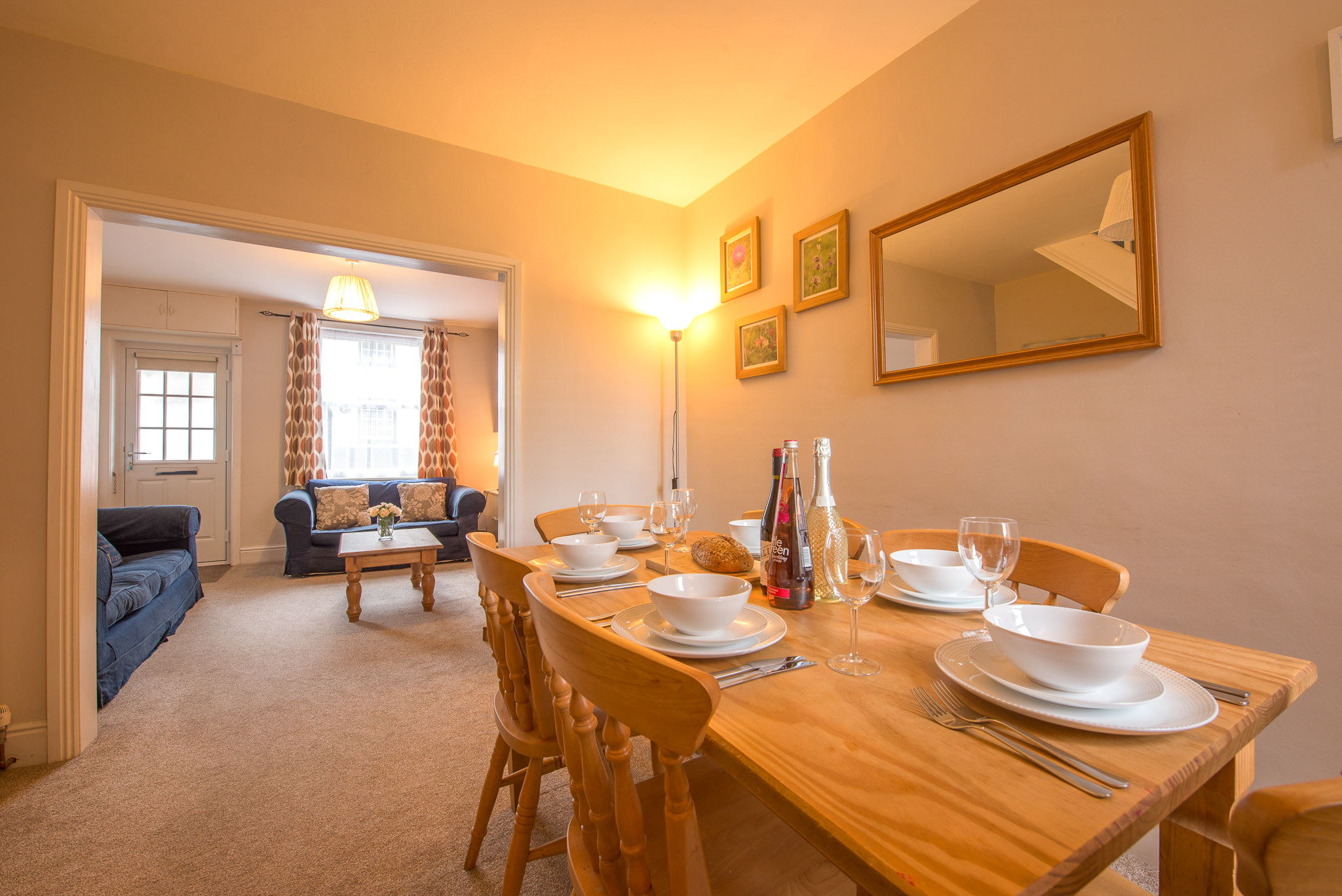 Stepping inside you are greeted by a lounge offering comfortable seating, with a TV and DVD player with a good selection of DVDs, the perfect place to relax after a day out exploring. From here step through to the open-plan dining room which provides an ideal social space for a family get together, with a dining table and chairs and a sideboard which provides a good selection of family games for a competitive night in and choice of books for a quiet relaxing evening.