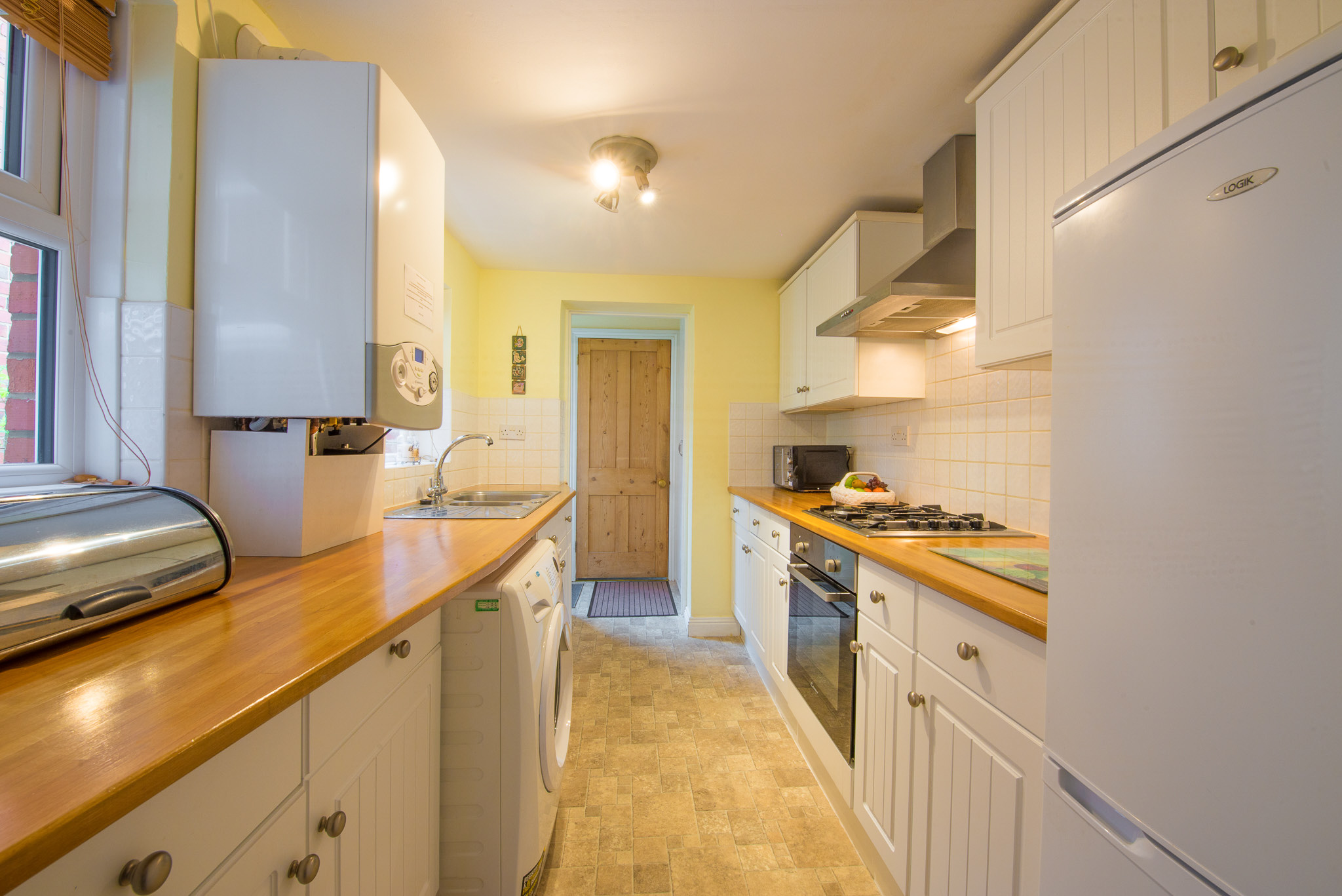 Beyond the dining room is a fully equipped kitchen, with an electric oven and gas hob, a fridge/freezer, a microwave and washing machine. There is a small lobby area which provides storage for coats and boots and a door to the rear garden and then a ground floor bathroom, which has a bath, with a powerful shower over bath, WC and hand basin.
