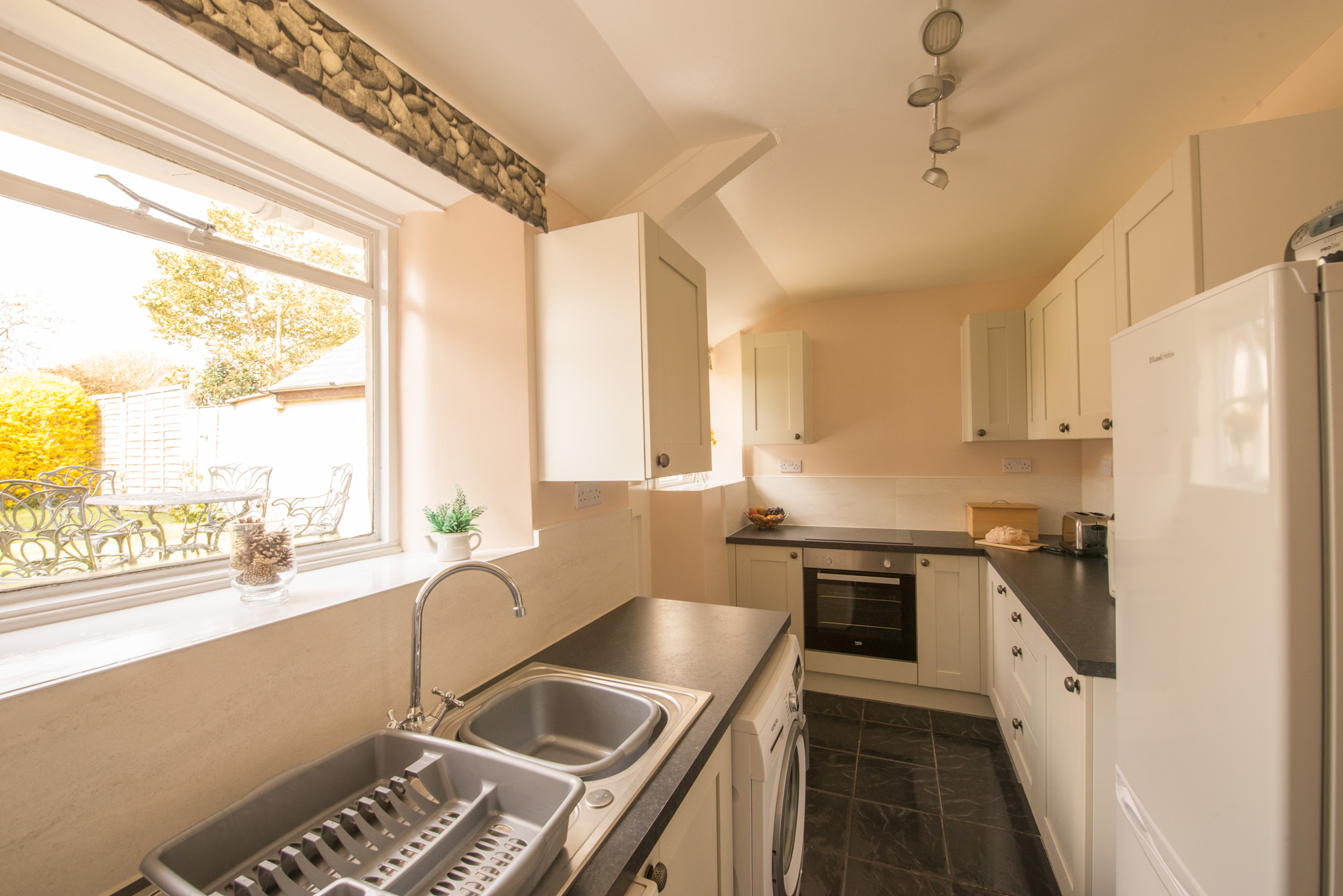 At the rear of the cottage is a well equipped kitchen, with a door leading onto a secluded, fully enclosed garden with good quality garden furniture.