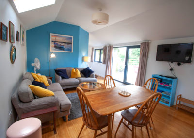 It is an architect designed cottage which is all on one level. It is ideally situated right next to Weavers Way, perfect for quiet dog walks. The sliding door in the open plan living room opens right onto the lovely secure patio, which has a small grassed area.
