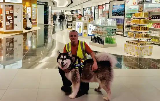 Alaskan Malamute and airport therapy dog Harley and his owner, Niel Chisholm, are scaling new heights. Joanne Bednall…