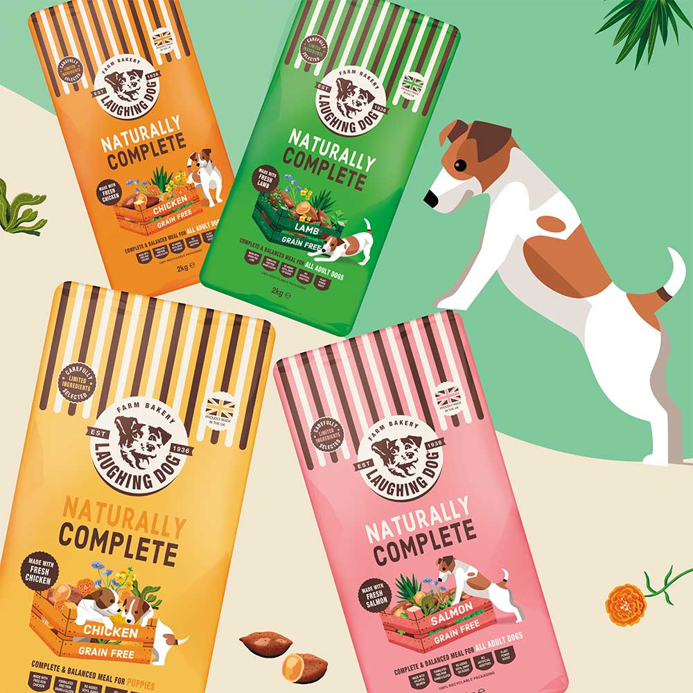 Baked dog food — baking using less severe heat, steam and pressure than extruded foods. The ingredients are mixed together and shaped to form kibble pieces. These are then baked — imagine making biscuits in your oven at home! Once the kibble has cooled, then any supplements, such as minerals and vitamins, can be added. It is a much slower and more gentle process than extrusion. While typically more expensive than extruded foods, baked foods can be considerably cheaper than some of the other methods of producing dry dog food. Laughing Dog make an excellent range of baked dog food treats and their website clearly states the health reasons behind why the ingredients have been chosen. You can find out more by visiting Laughing Dog Food.