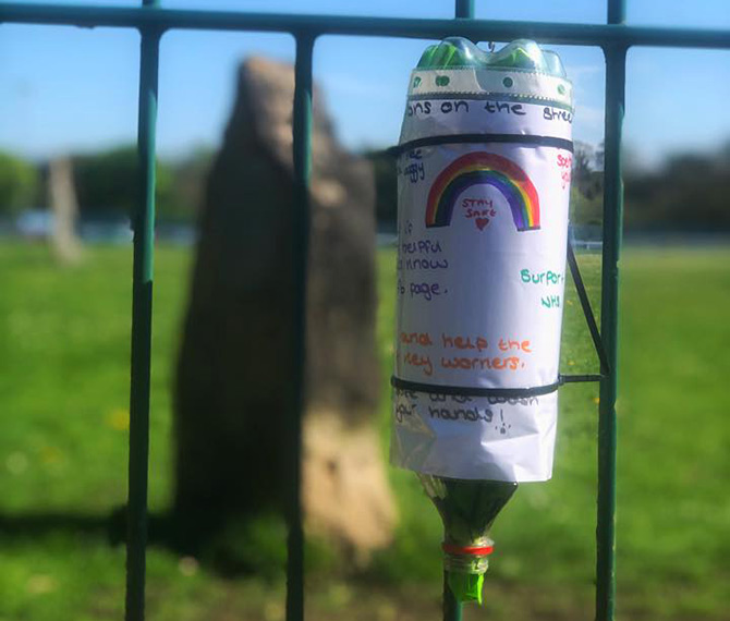 The homemade poo bag dispensers are created from recycled plastic bottles, and are creatively decorated with an eye-catching poster, with pictures of rainbows, interesting dog facts, and quirky poems, such as: