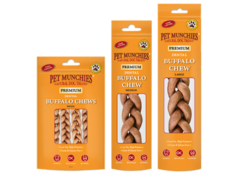 Dental chewsBuffalo gourmet dental chews are made with 100 per cent natural, human-grade, grass-fed buffalo, infused with salmon oil. These super-healthy, long-lasting treats are low in fat, high in protein, and due to the high levels of omega 3 promote a healthy skin and coat, joint mobility, and good oral hygiene. Find out more at www.pet-munchies.com |