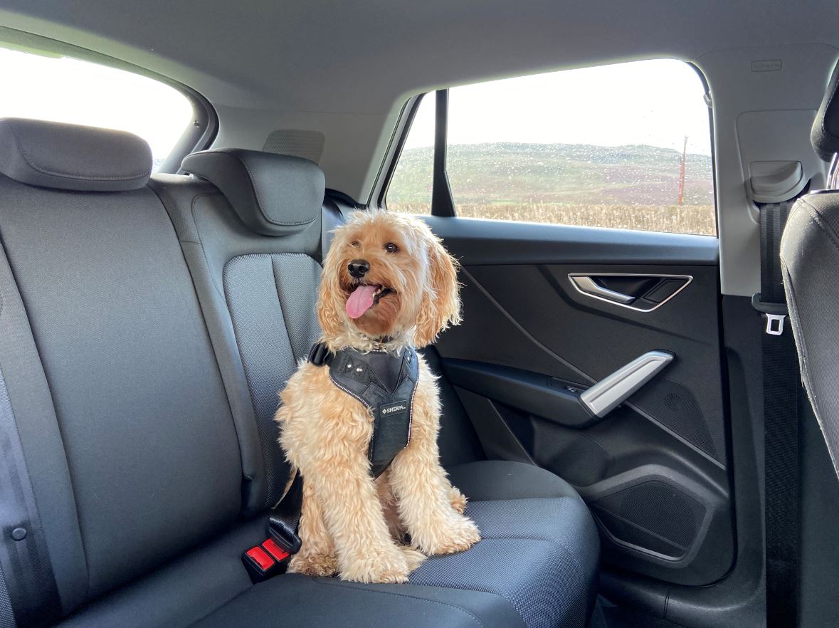 Sherpa crash-tested safety harnesses have a step-in design that makes them easy to fit and remove. They work with the existing seatbelts so the dog can sit, stand, or lie down. They double as a walking harness – attach a lead – and are comfortable enough for all day use. Be sure to turn off the passenger airbag if the dog is travelling on the passenger seat.