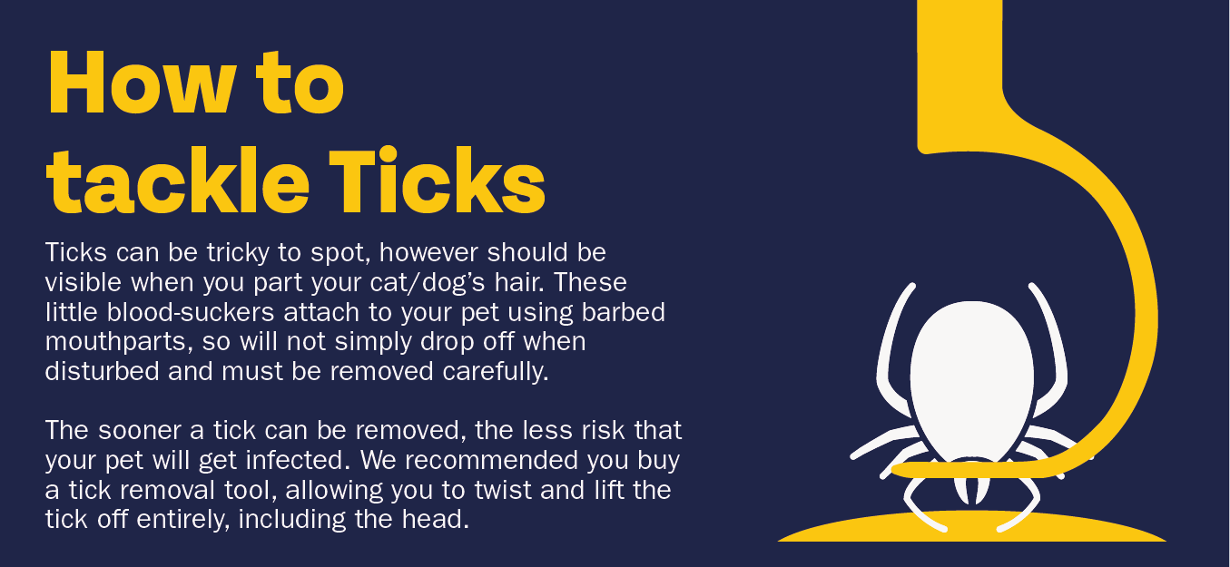 Top Tip: Check your cat/dog regularly by thoroughly combing through their fur in both directions. Pay particular attention to their armpits, groin, ears and neck areas. Don’t forget to check between their toes and other tricky to reach spots.