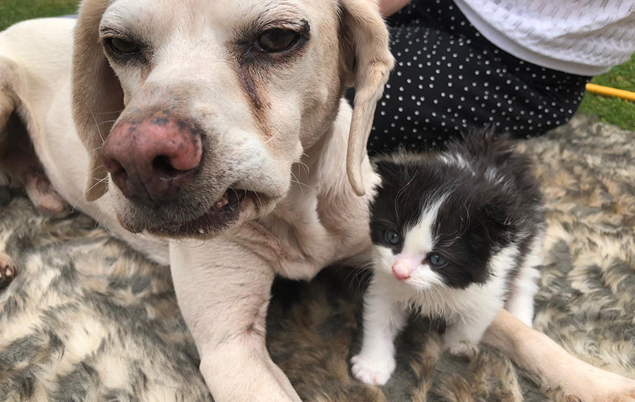 A former Battersea dog has been busy throughout lockdown, helping to hand-rear a tiny kitten who had been left homeless.