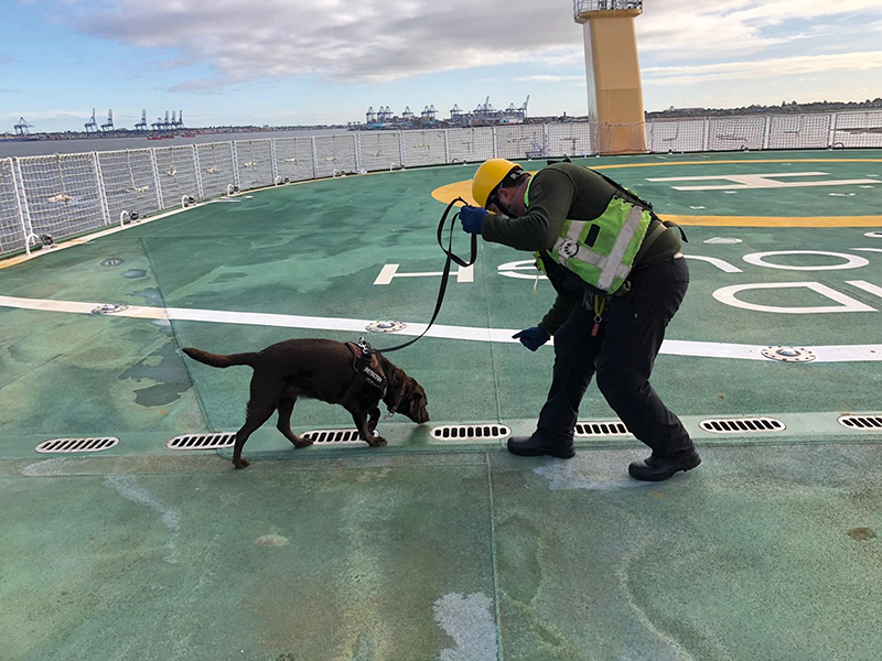 “They have to be able to climb around the vessel without running around crazily, and to be controlled without becoming demoralised. This is such a big ship — there are helipads, helicopter hangars, and so many different decks to it. It’s not always just about the odour with detection dogs, it’s about everything else in their environment too.”