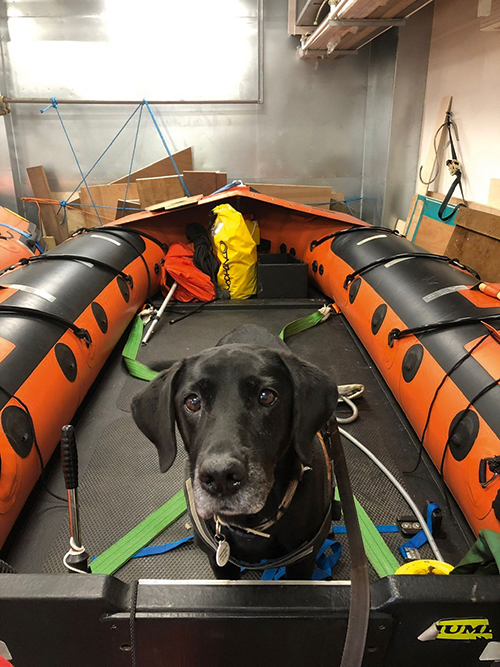 “They need to get used to the water’s edge, and being craned into the hull. A lot of the floor surfaces are grids which their feet will go through, so the dogs have to wear booties to protect their paws.