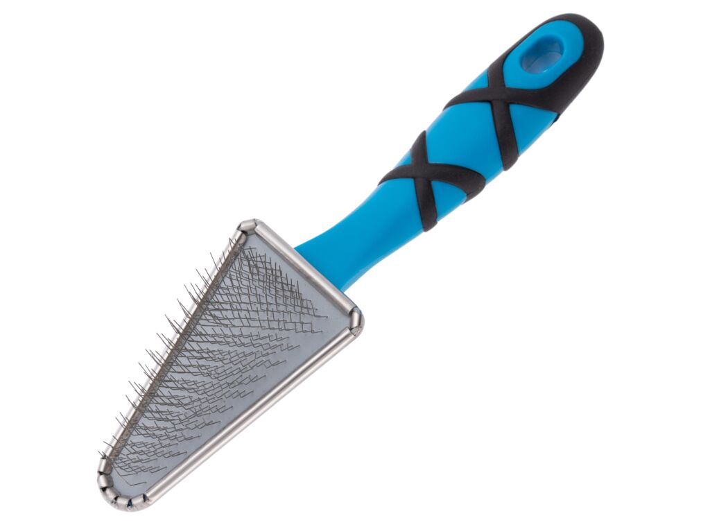 Pros: The unique triangle shape is perfect for hard-to-reach areas like the armpits, face, and underbelly. Its soft pins are gentle on sensitive areas while providing thorough brushing. Ideal for smaller breeds or delicate coats.