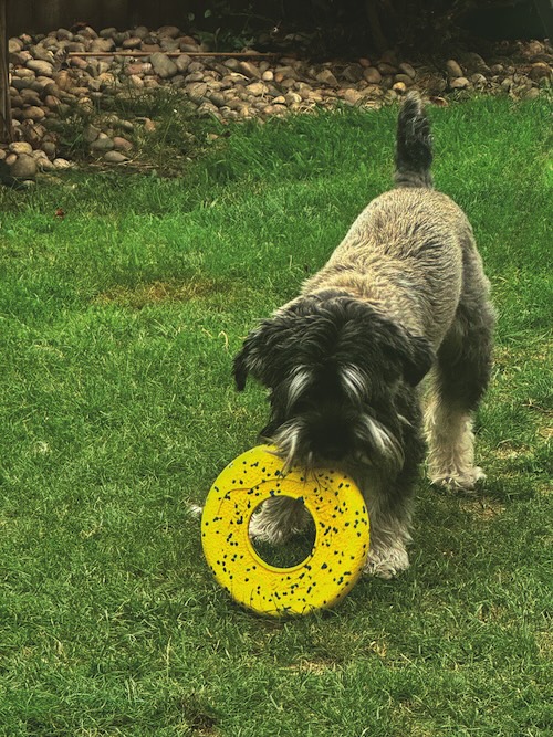 The material is soft and really squeezable in your fingers, yet it’s incredibly durable. Our dog has played fetch with this over and over, and it flies really well in the air. My son and I even ended up having a competition to see who could throw it the furthest (I won!). All the while, Peggy, our Schnauzer, was running back and forth, loving the game between us.