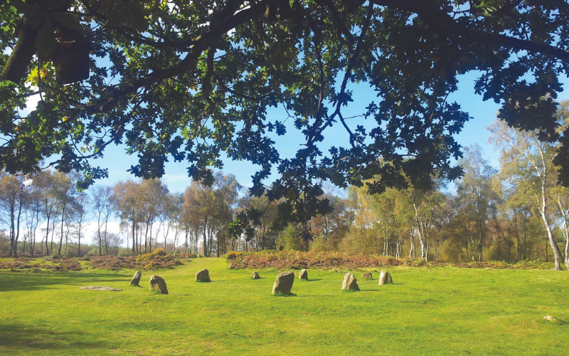 - Here the woodland opens out into a stunning glade and The Nine Ladies stone circle surrounded by ethereal silver birch trees. With the stone circle on the left, walk as far as an interpretation board and turn left. Continue through a gate and keep the stone wall on the right.